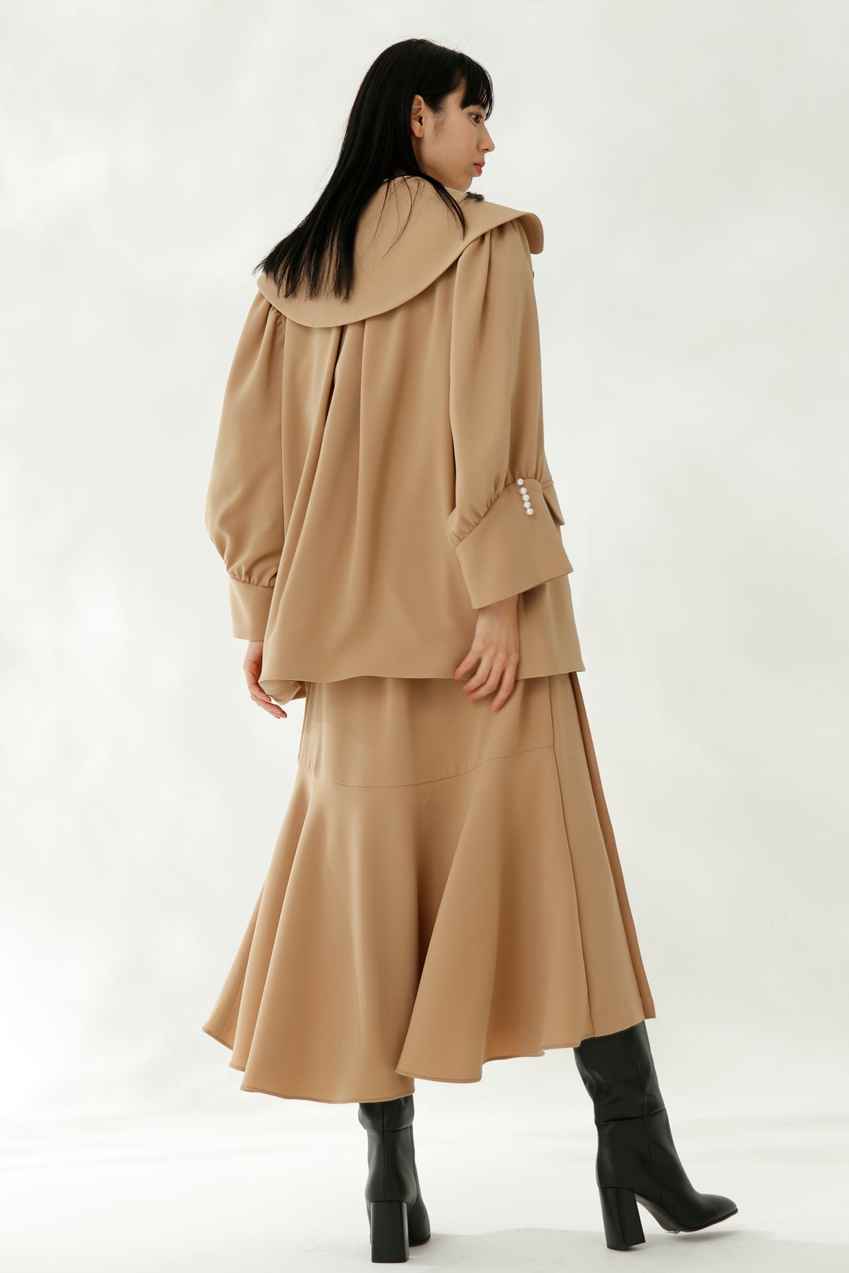 柔らかなカーブを描きながら左右に広がった襟と、丸みを帯びたボリュームたっぷりの袖。