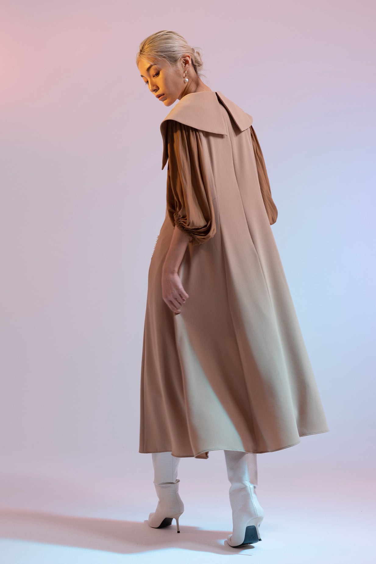 大きな襟と、分量感のあるボリューム袖が印象的なドレス。