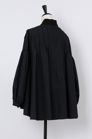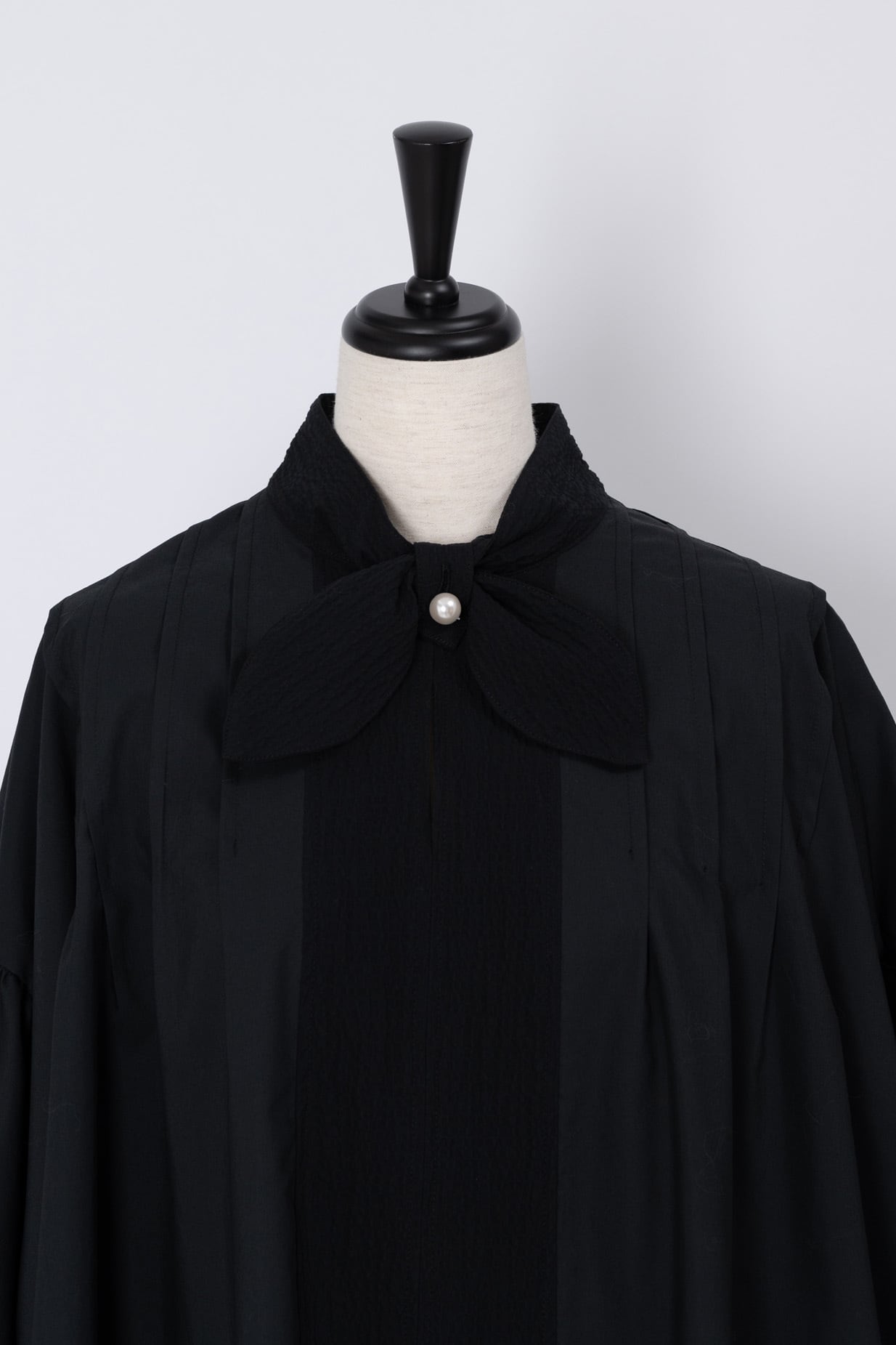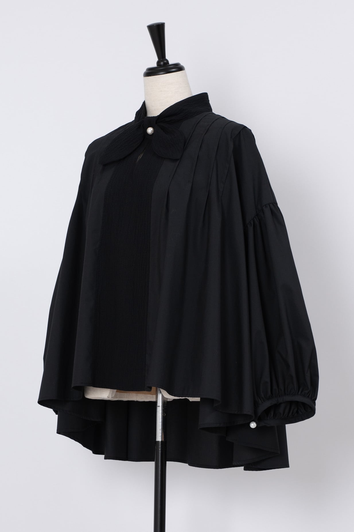 ネックのリボンタイとパール釦がクラシックな雰囲気のビッグシルエットブラウス。