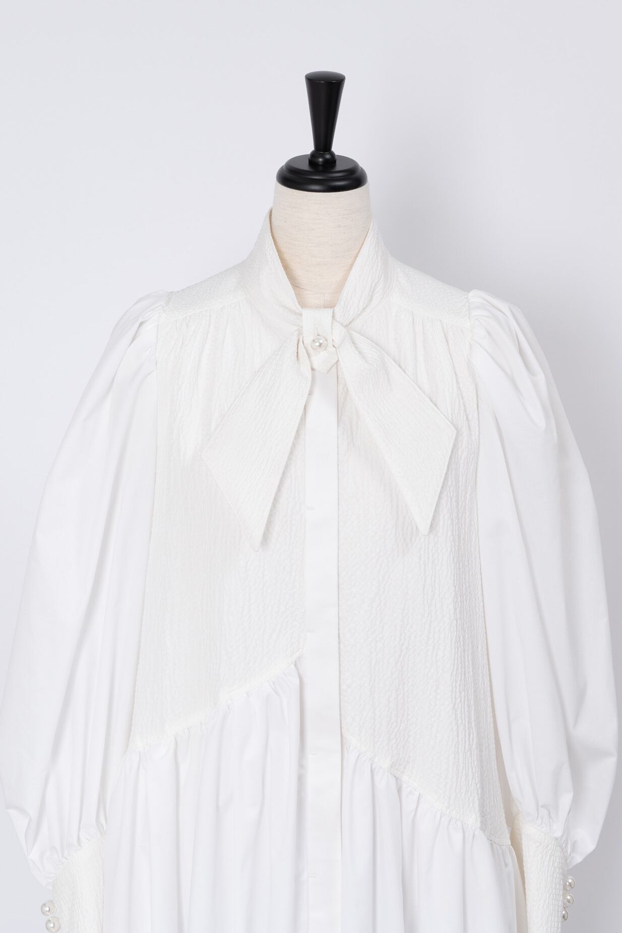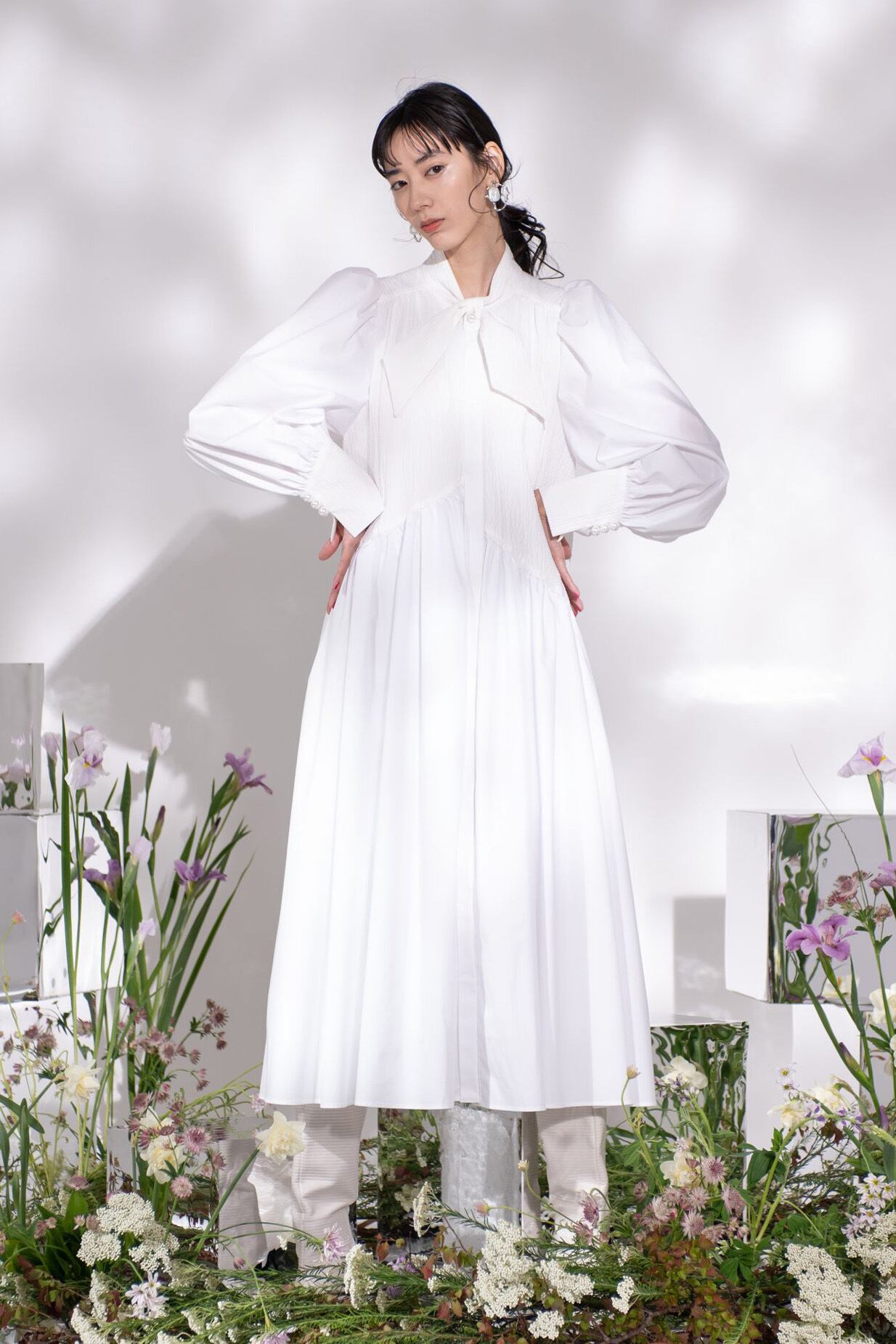 ネックのリボンタイとパール釦がクラシックな雰囲気のワンピース。