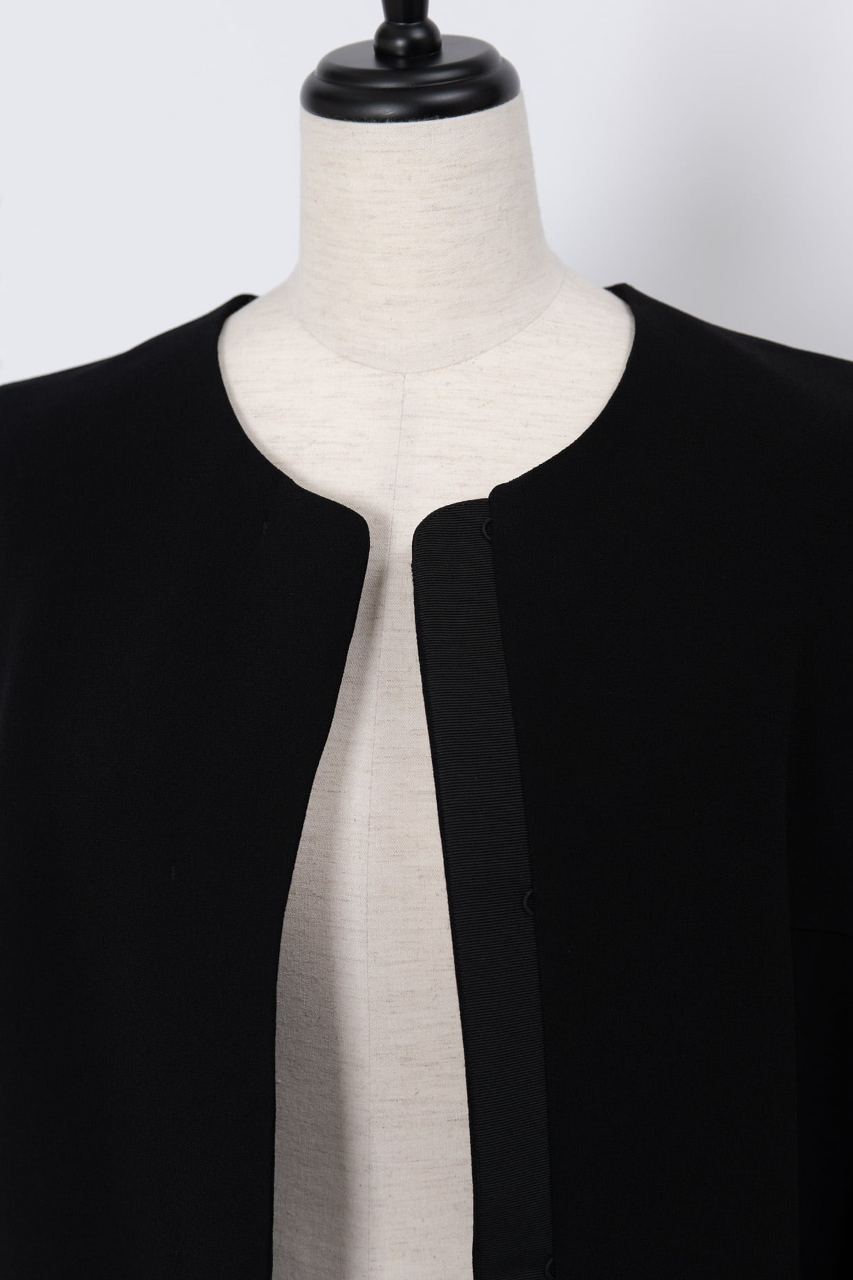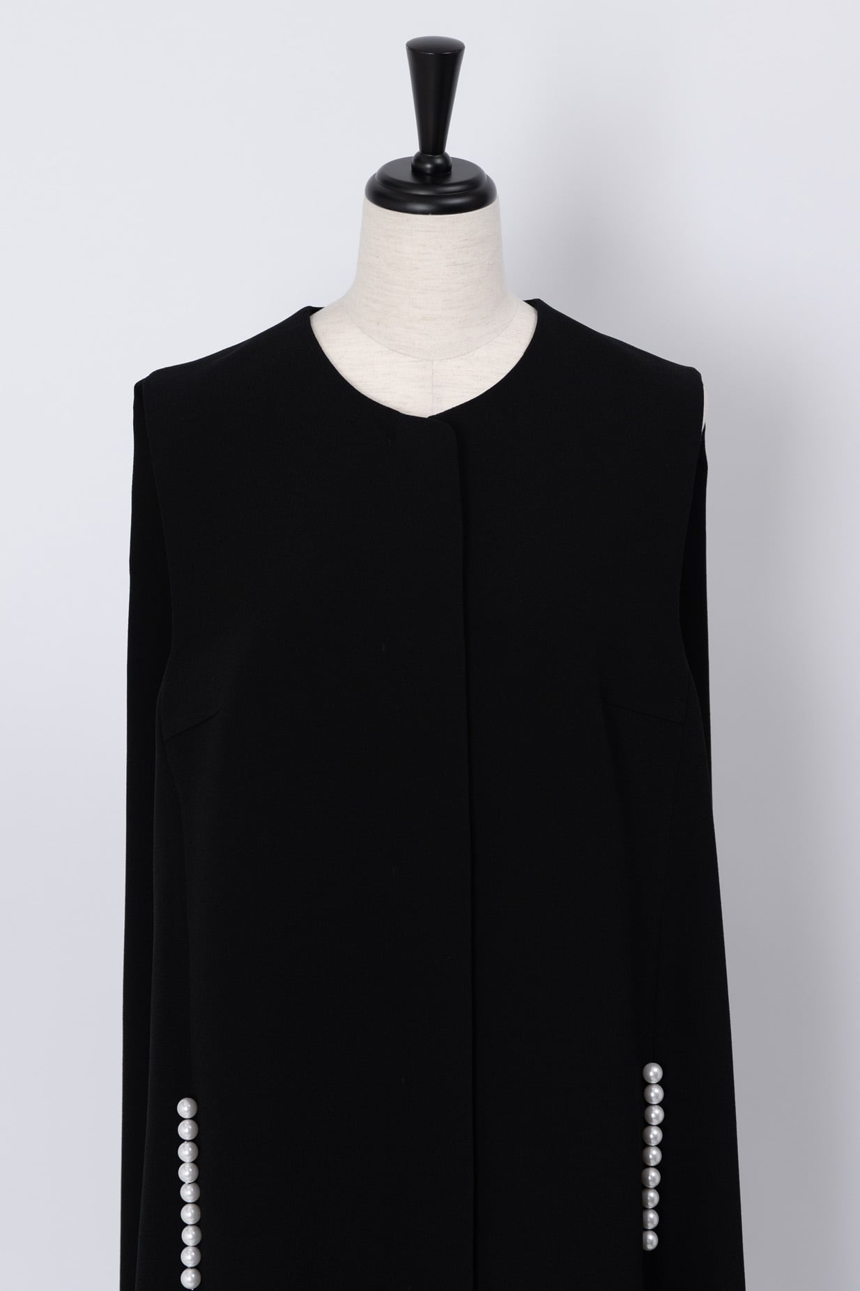 両脇のポケット部分にパールを連ねた、フェミニンなノーカラーのジレドレス。