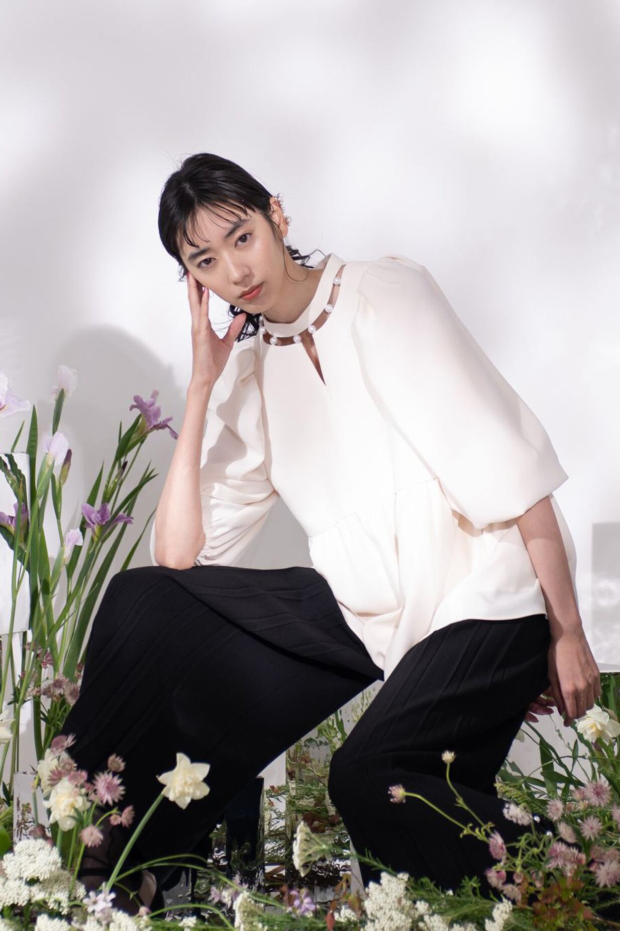 ふんわりとした軽やかなバルーンスリーブの袖口にはゴムを使用しており、袖丈がアレンジ可能に。