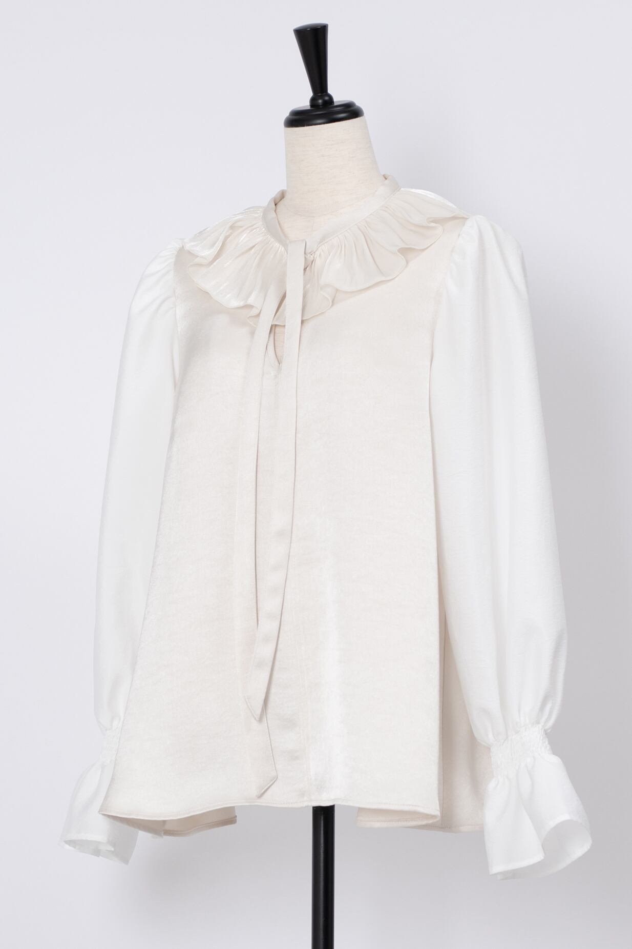 ネックラインのフリルと、フロントのリボンがフェミニンさを薫らせるブラウス。