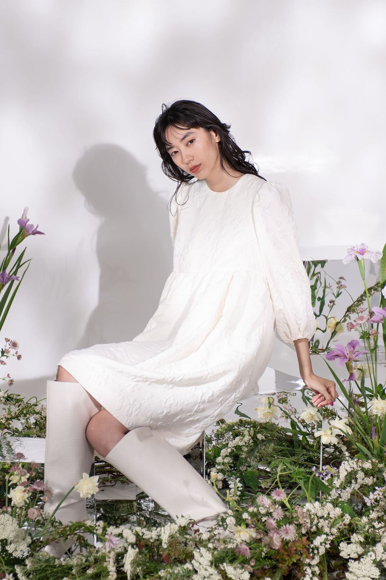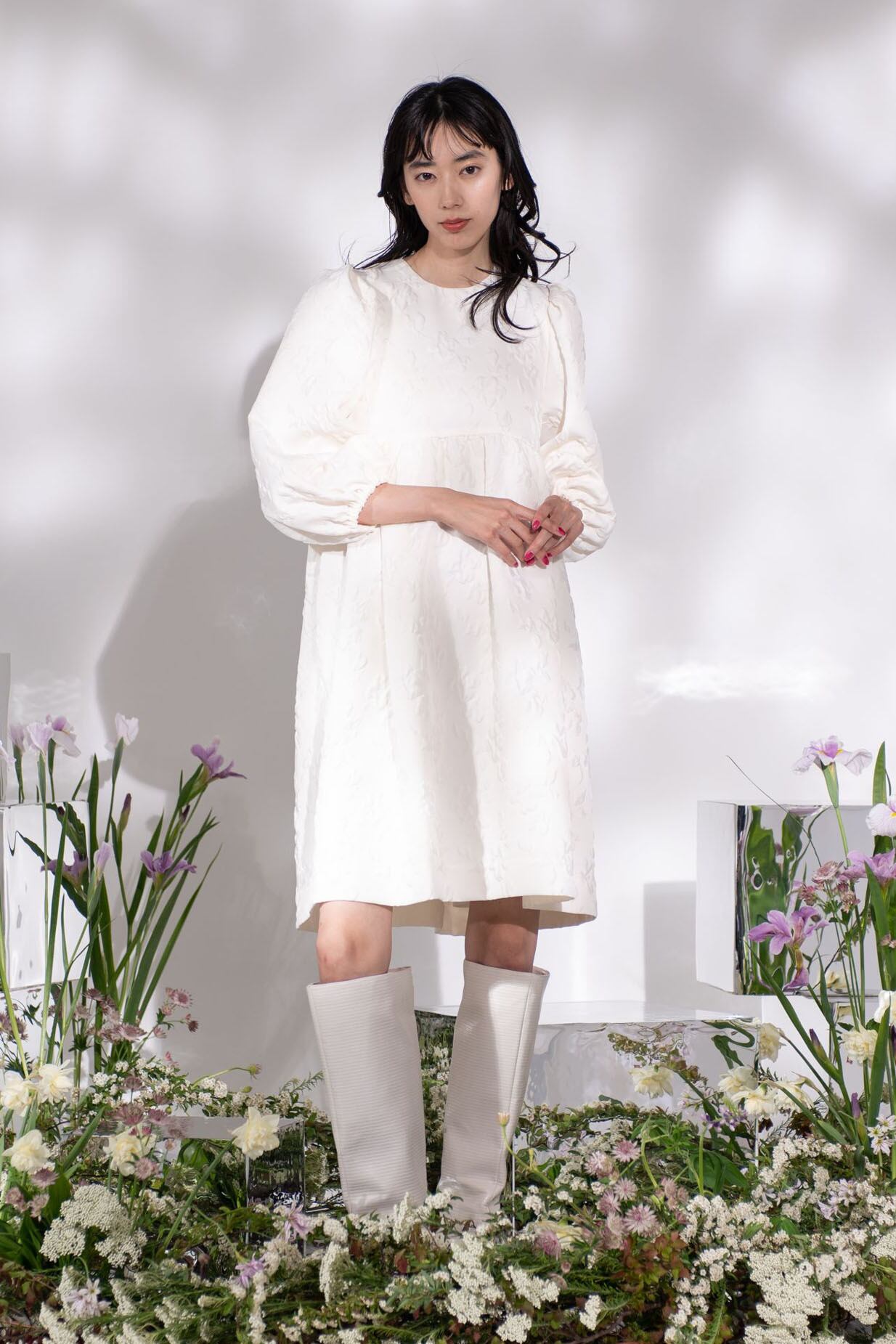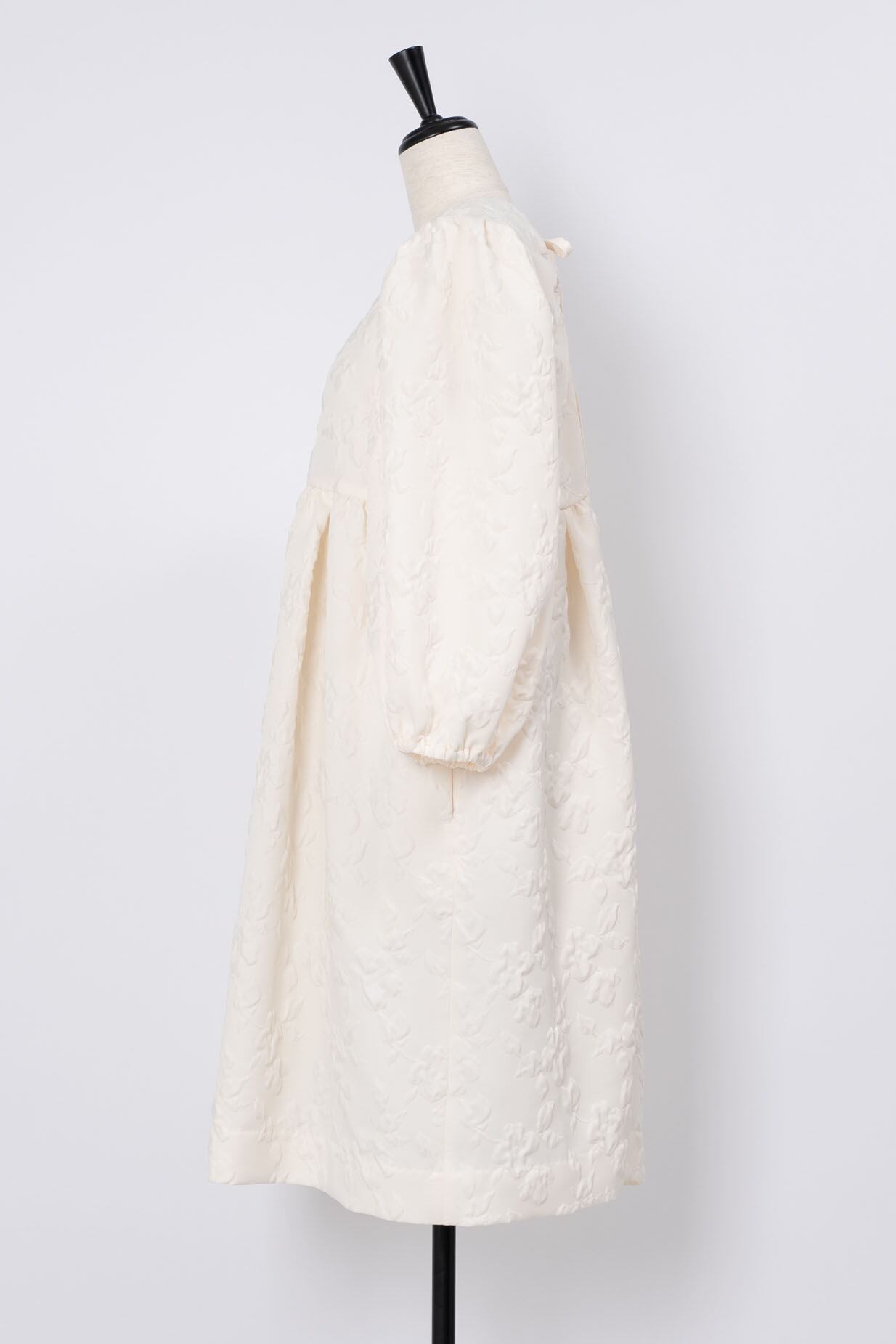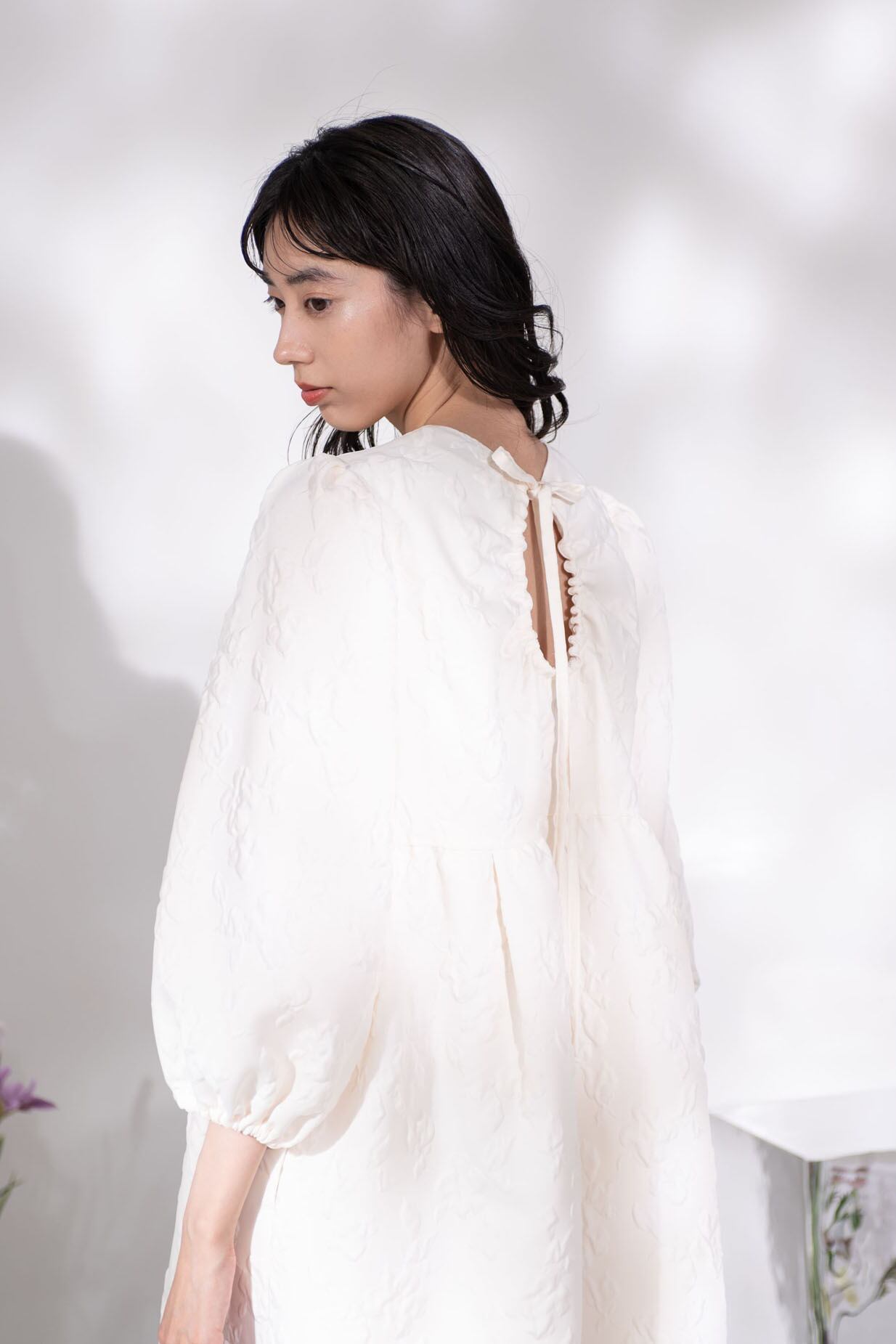 水面にゆらめく花の絨毯を連想するよう、表面をふくれ上がらせ模様を浮かびあげる「ふくれ織り」技法で織り上げたArobeオリジナルのジャガード生地で仕立てたミニドレス。