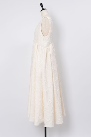 水面にゆらめく花の絨毯を連想するよう、表面をふくれ上がらせ模様を浮かびあげる「ふくれ織り」技法で織り上げたArobeオリジナルのジャガード生地で仕立てたドレス。