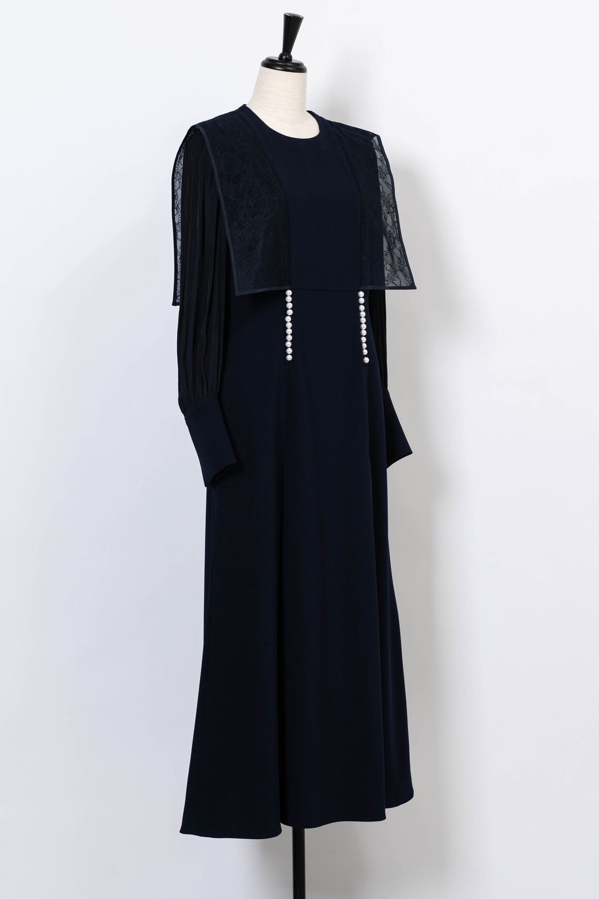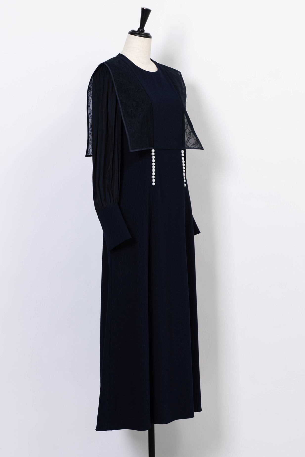 前見ごろと、カフスのスリット部分にあしらったパールが品良く映えるエレガントなドレス。