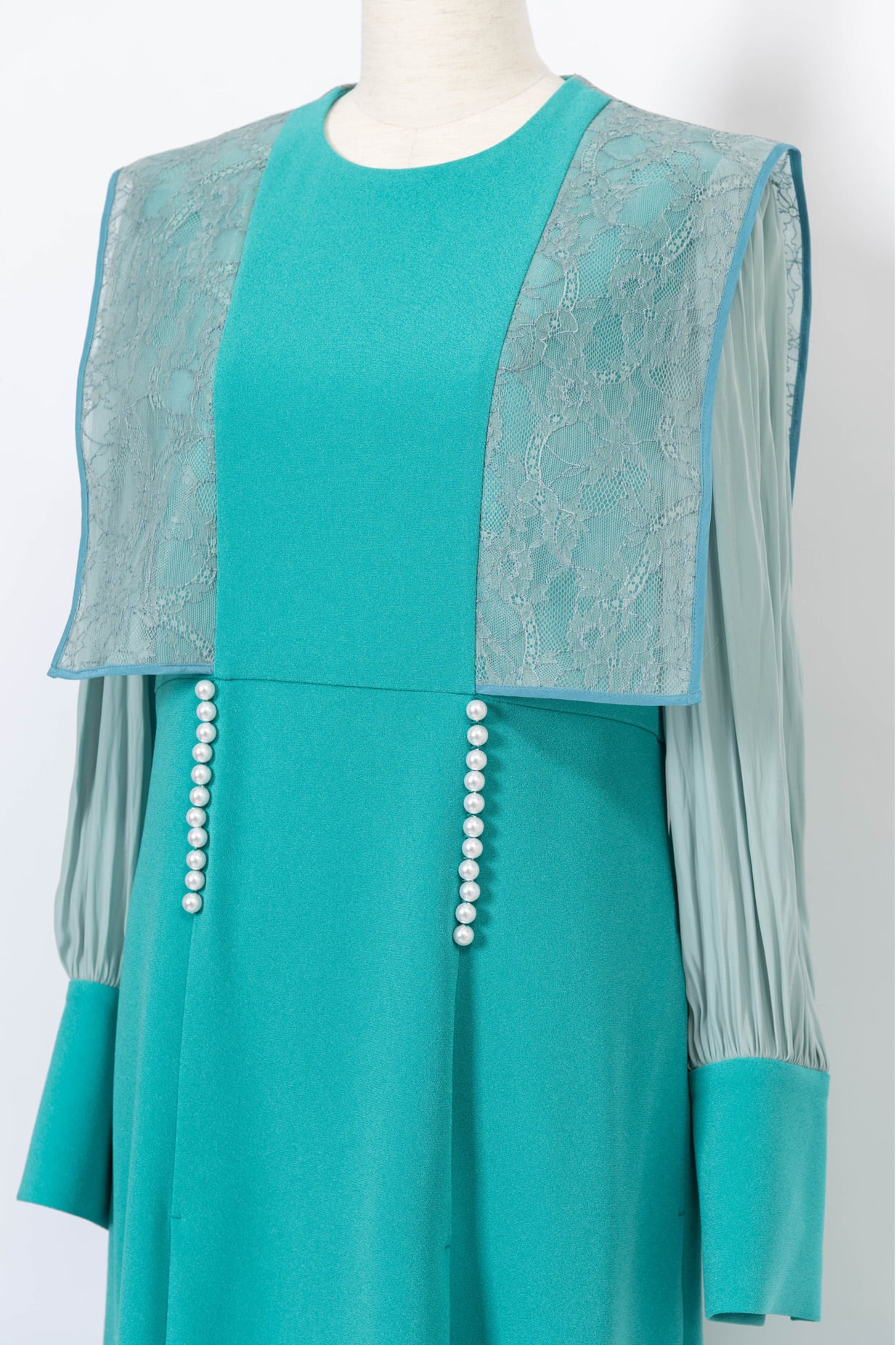 前見ごろと、カフスのスリット部分にあしらったパールが品良く映えるエレガントなドレス。