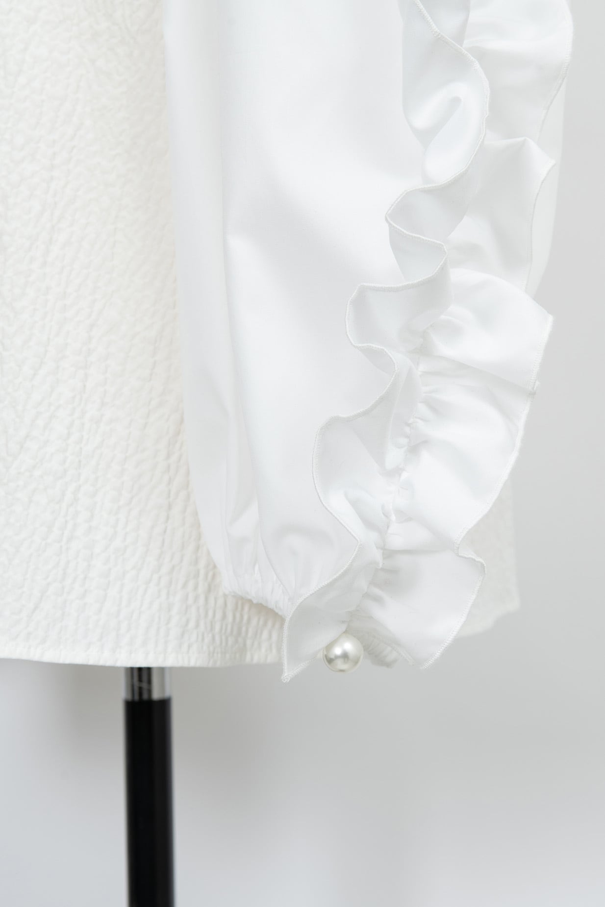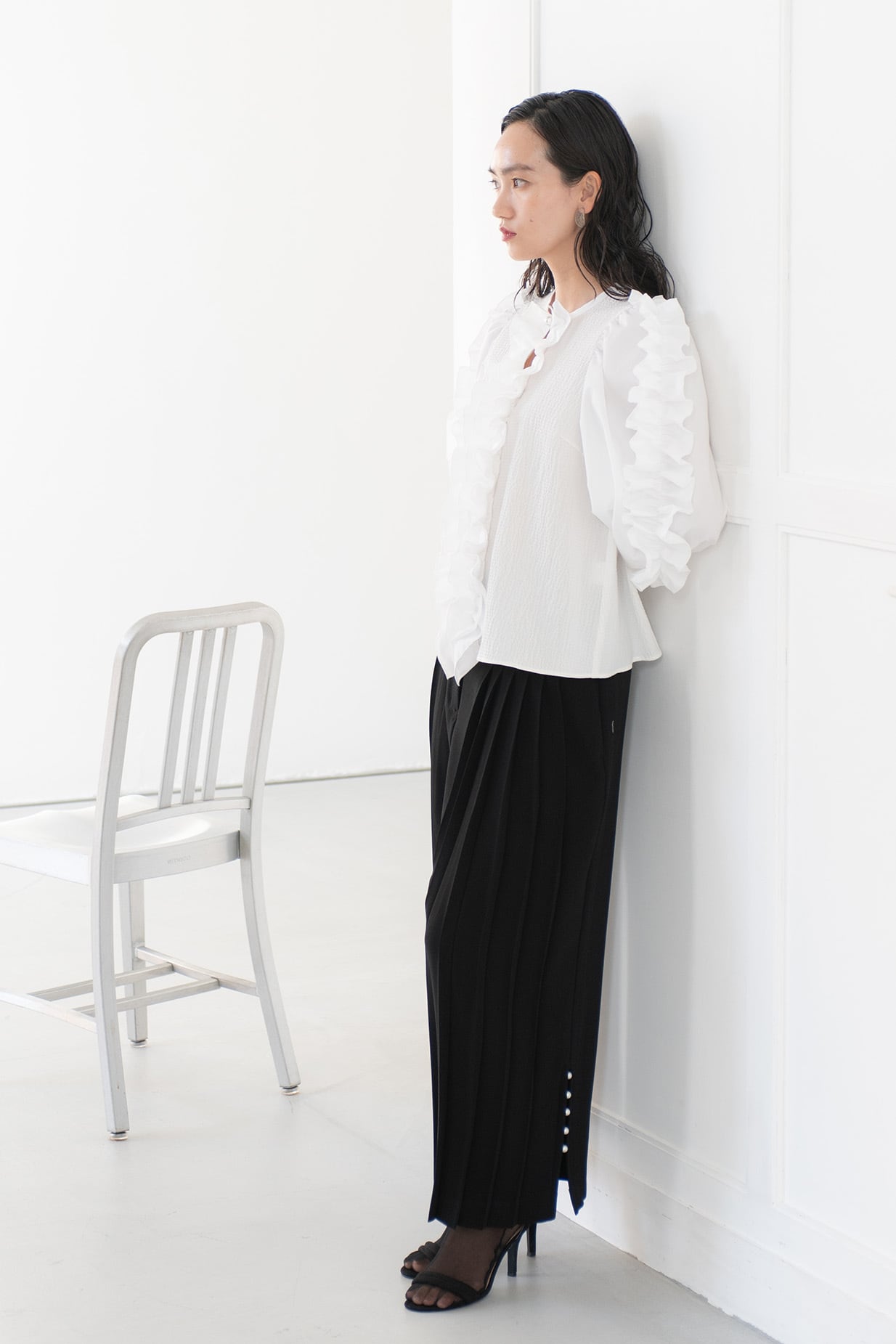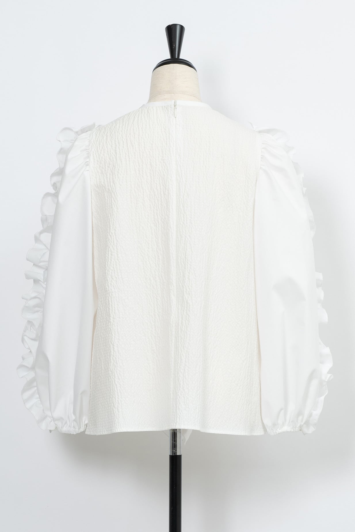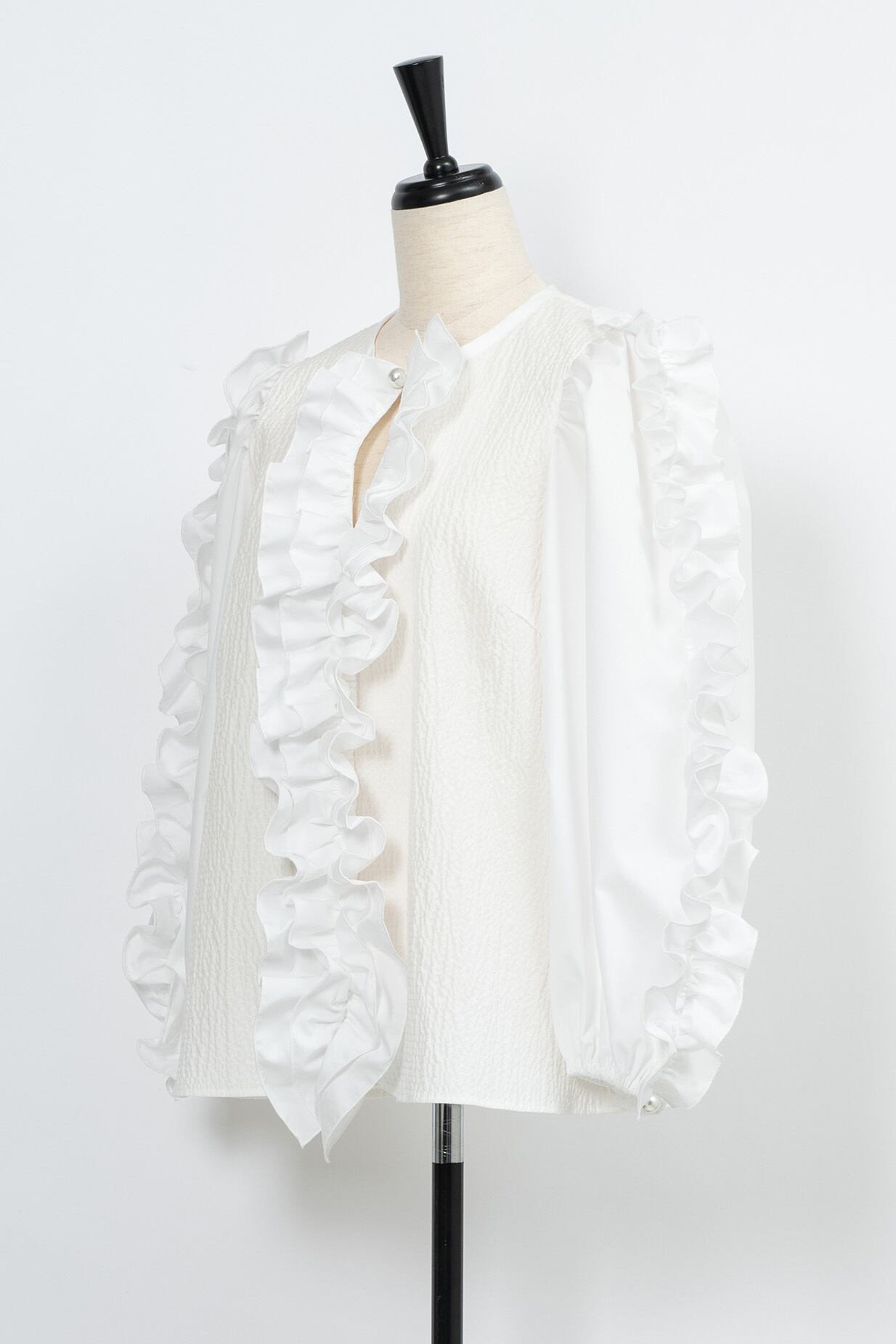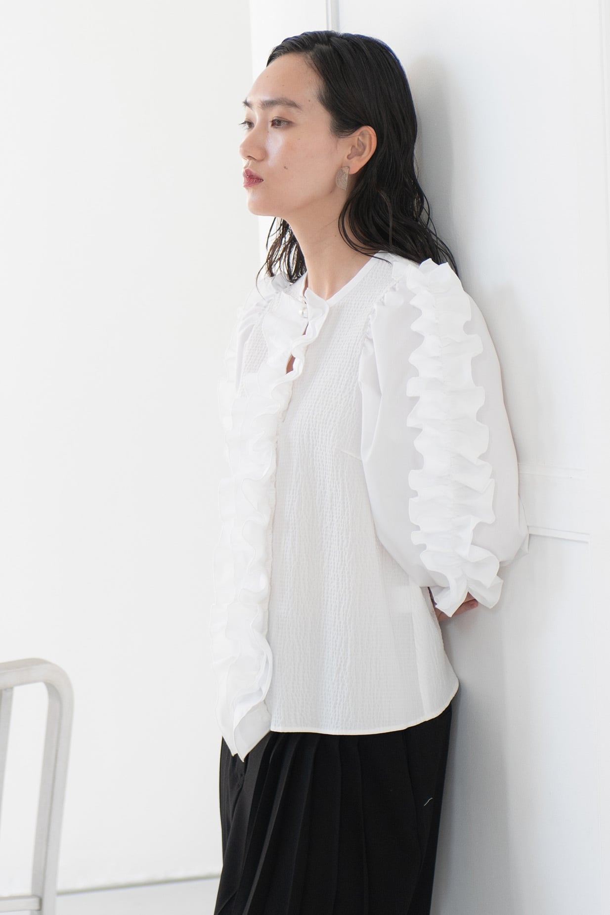可憐なフリルがドラマティックに施されたフェミニンさ薫るブラウス。