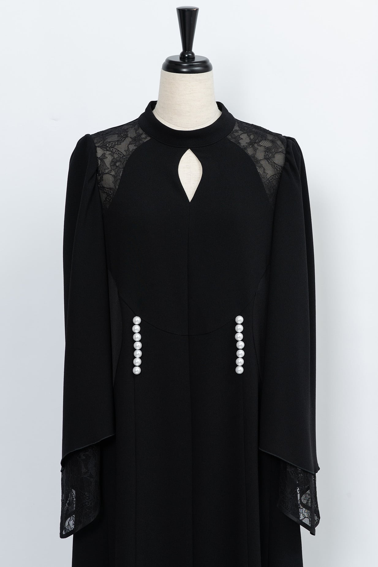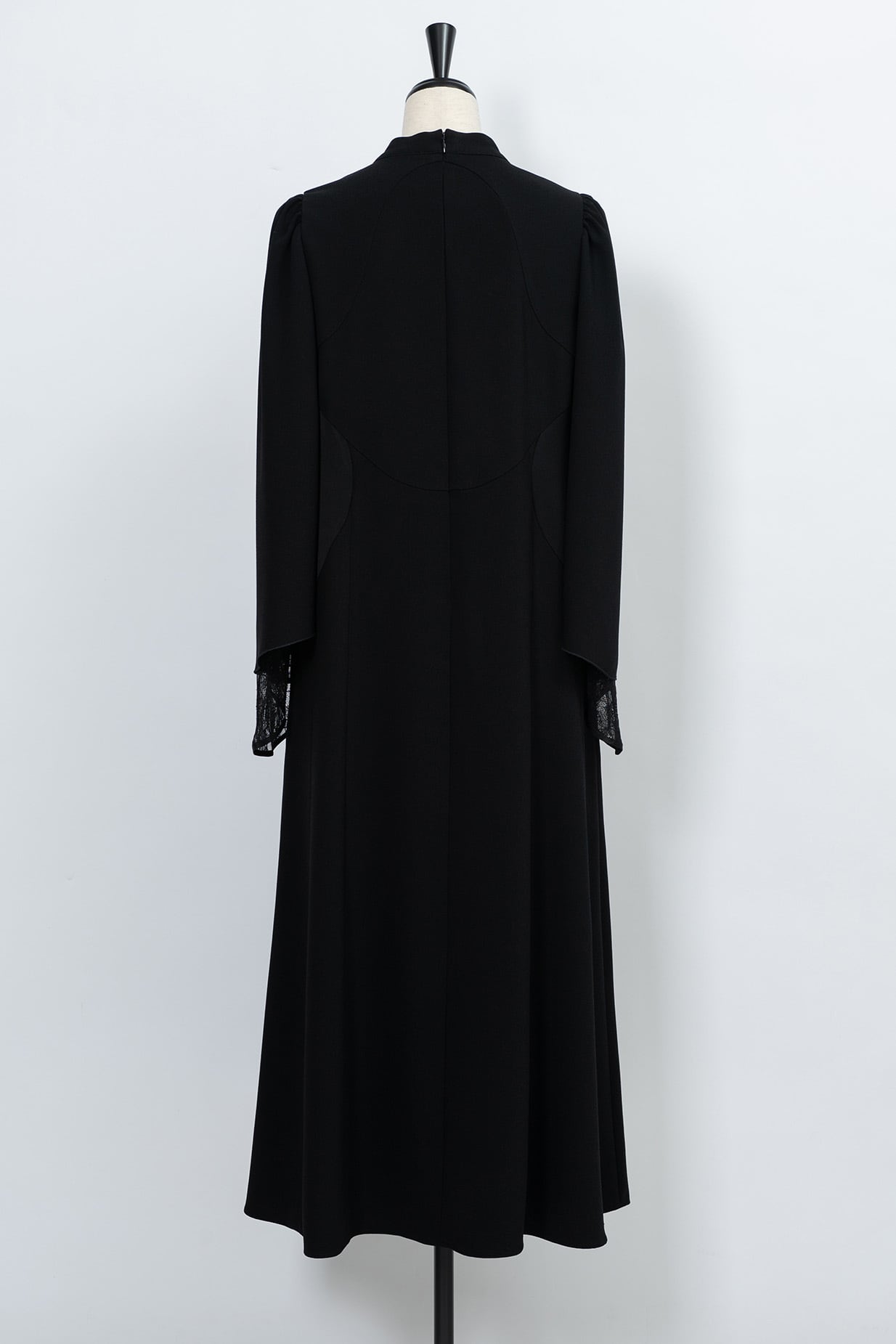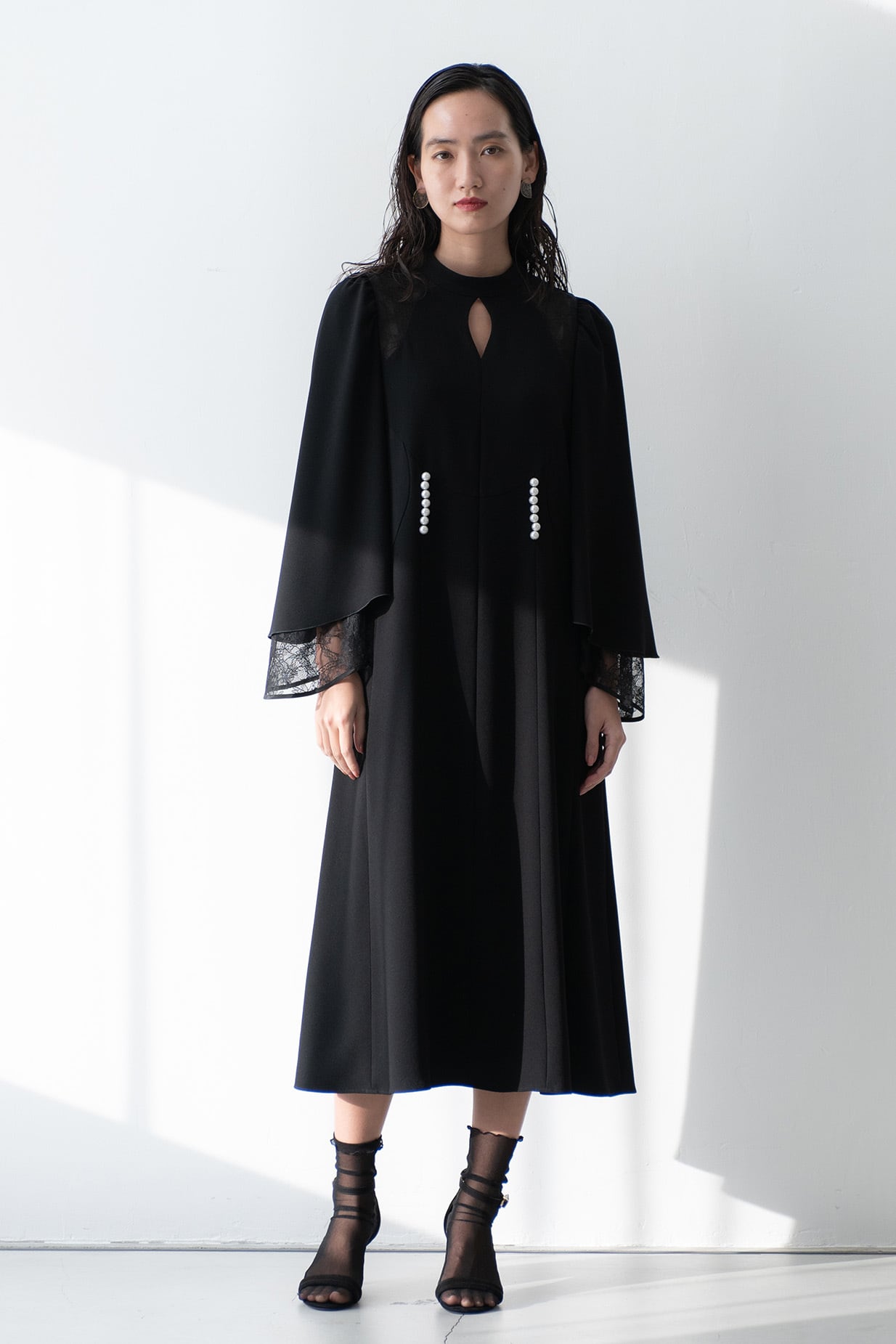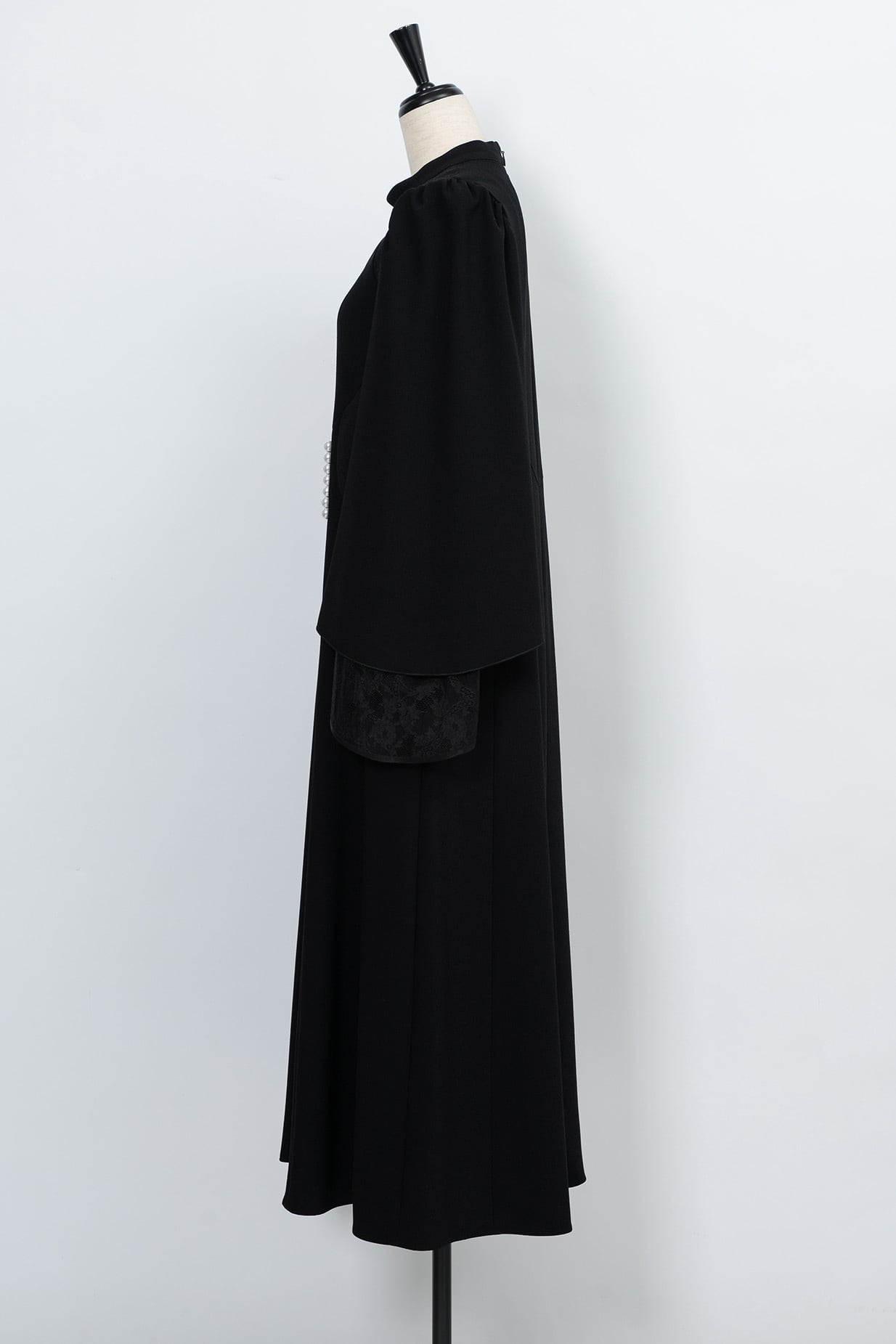 美しく広がるベルシルエットに仕上げた袖は、繊細なリバーレースと2枚重ねになっておりフェミニンな雰囲気を演出。