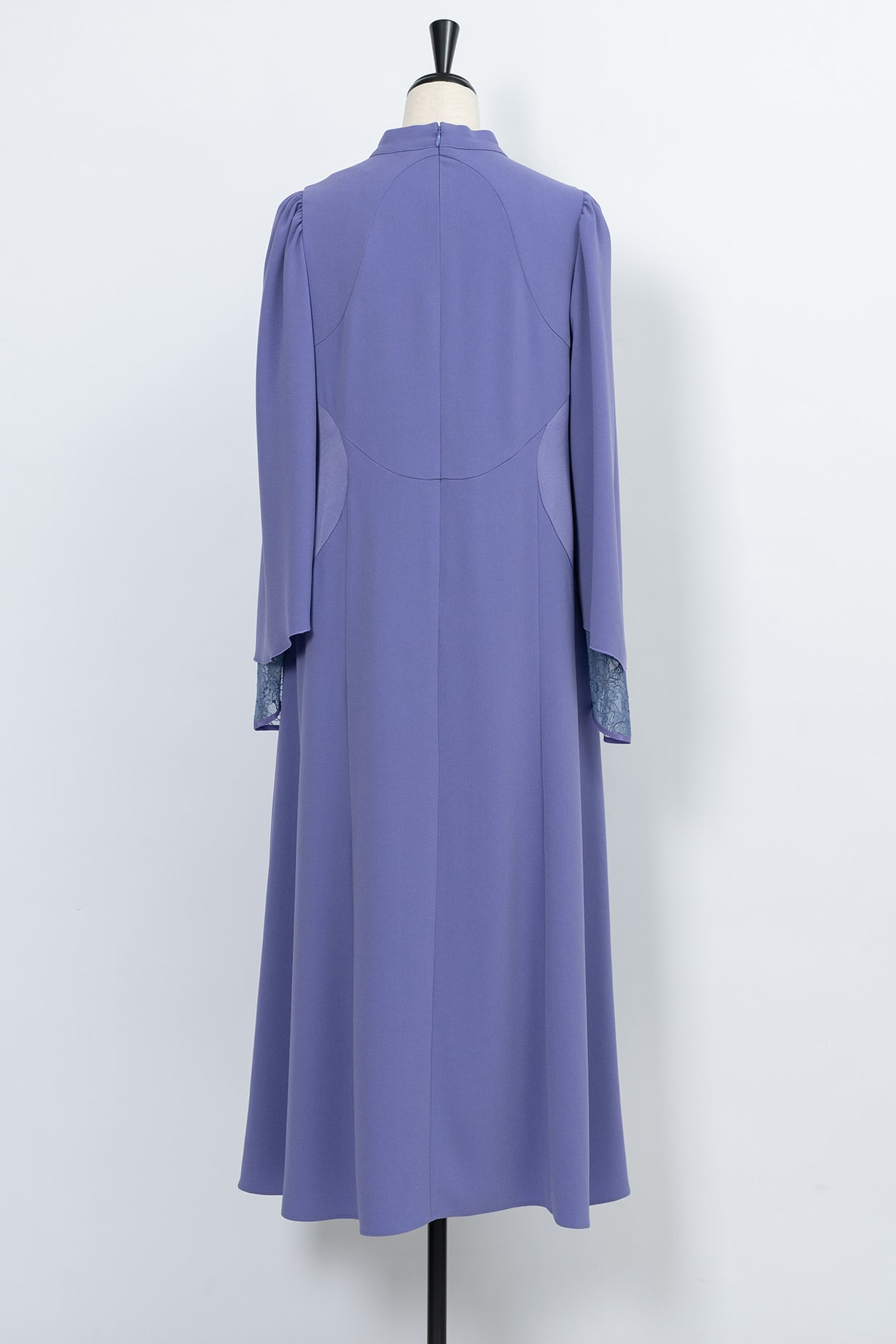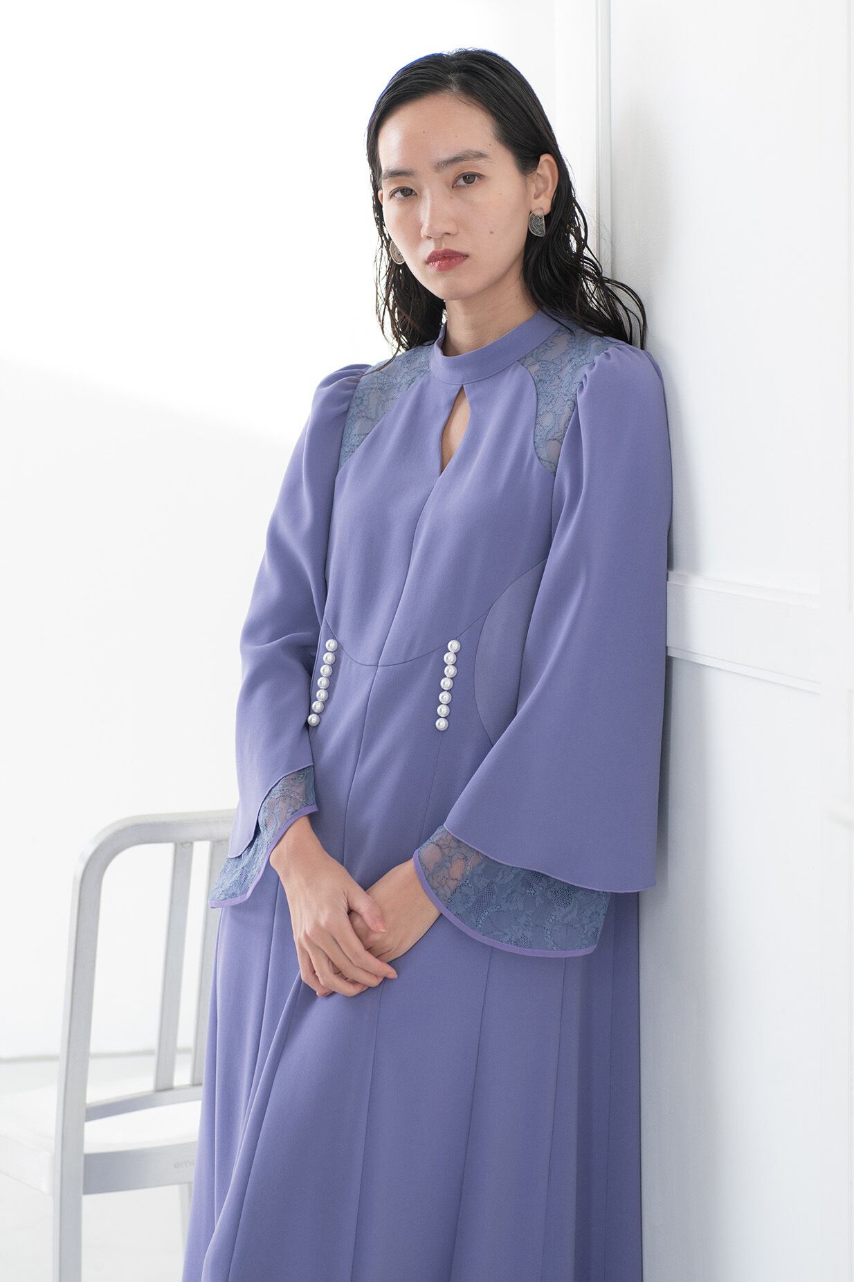 美しく広がるベルシルエットに仕上げた袖は、繊細なリバーレースと2枚重ねになっておりフェミニンな雰囲気を演出。