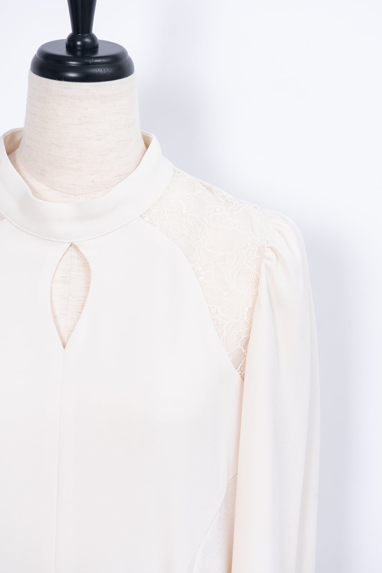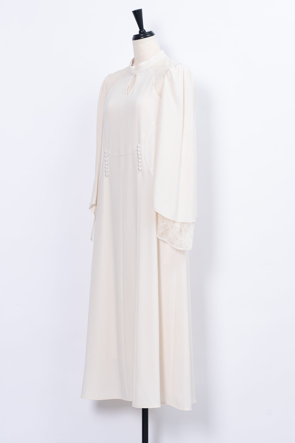 美しく広がるベルシルエットに仕上げた袖は、繊細なリバーレースと2枚重ねになっておりフェミニンな雰囲気を演出。