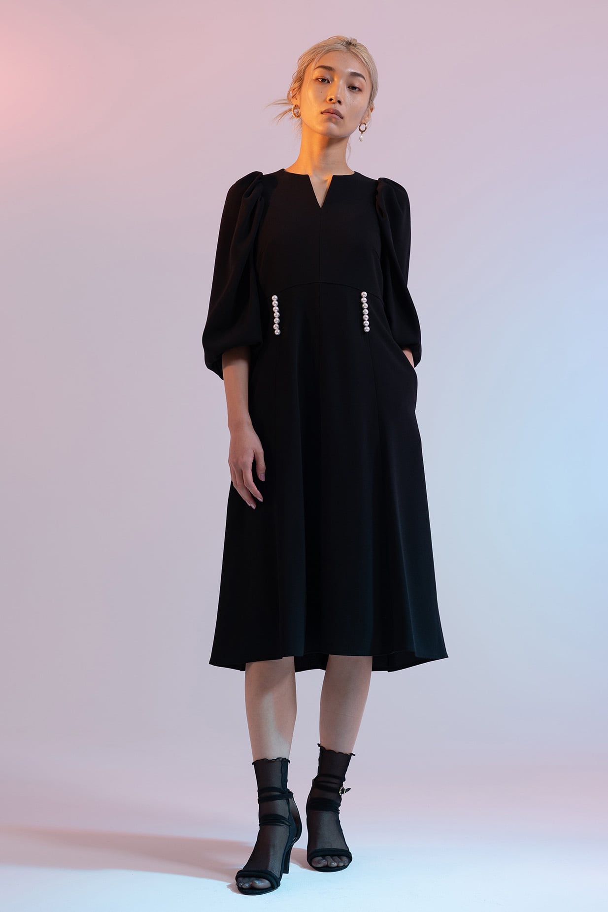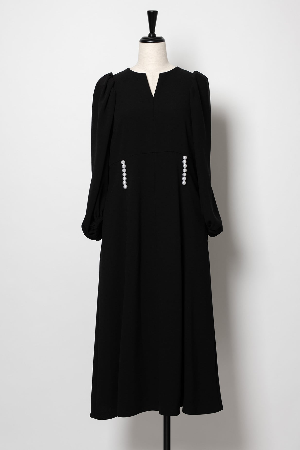 ウエストの切り替え部分にあしらったパールが品良く映えるエレガントなドレスは、フィットフレアなシルエットでメリハリのある女性らしい着こなしを叶えます。