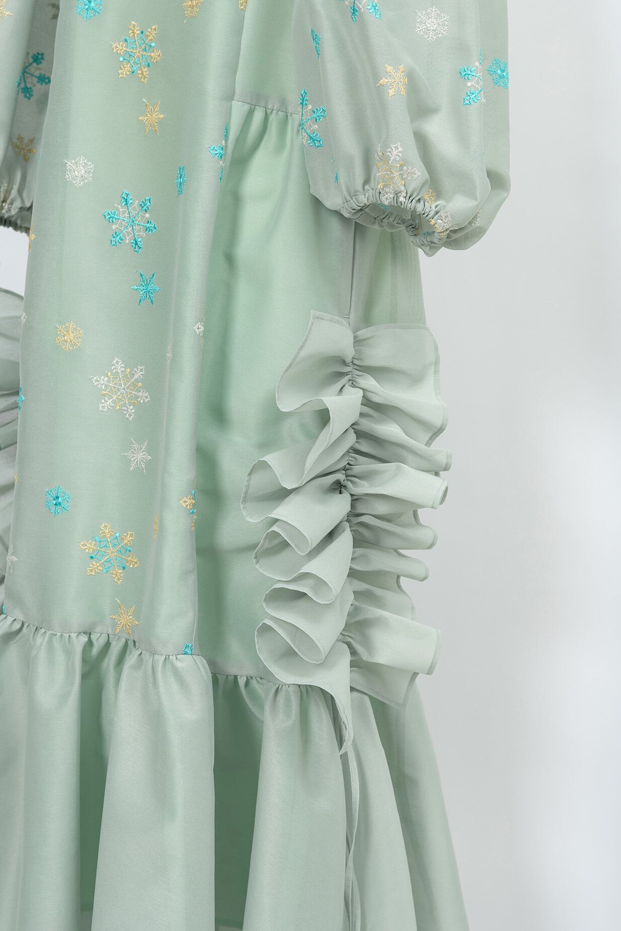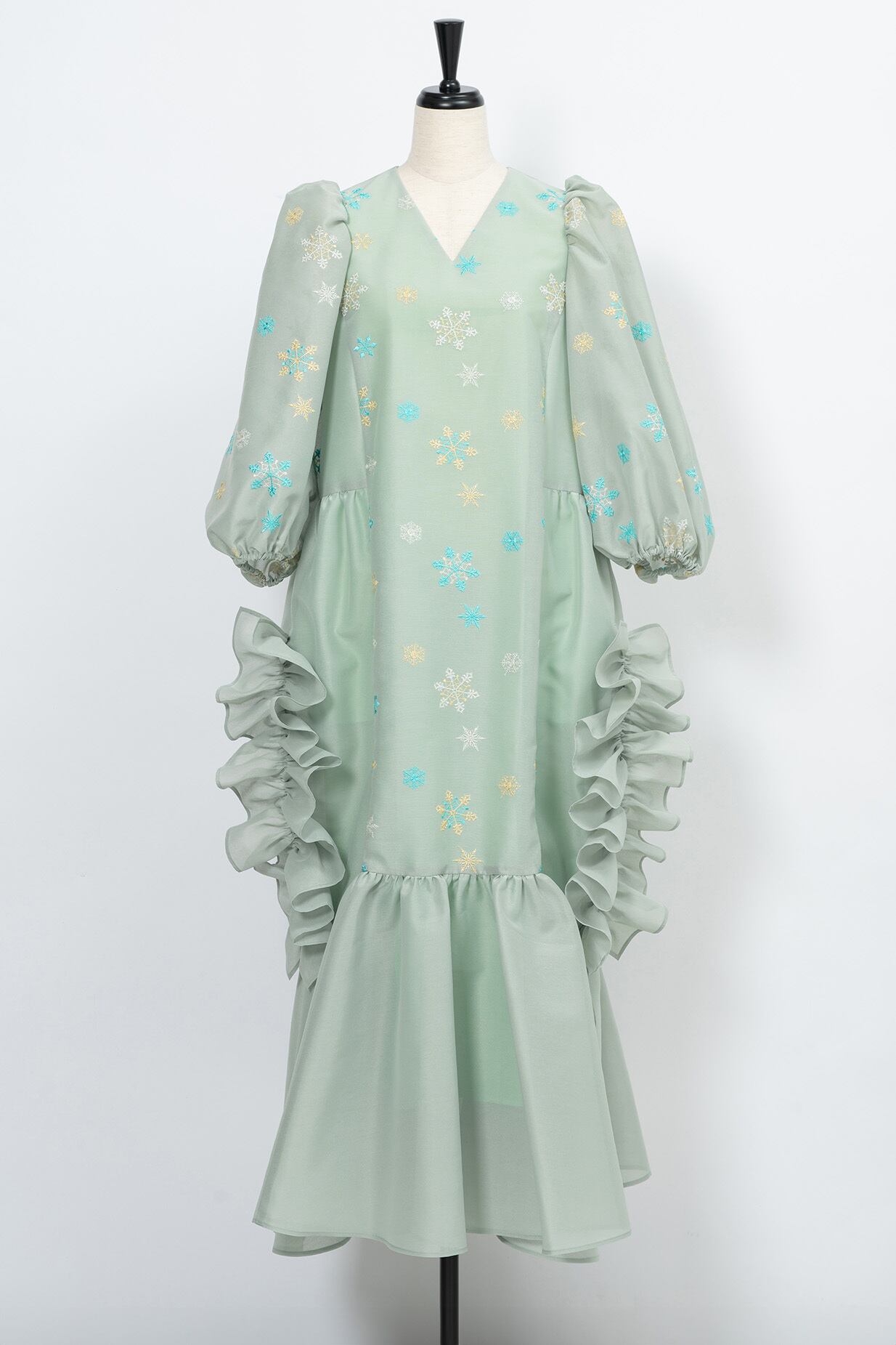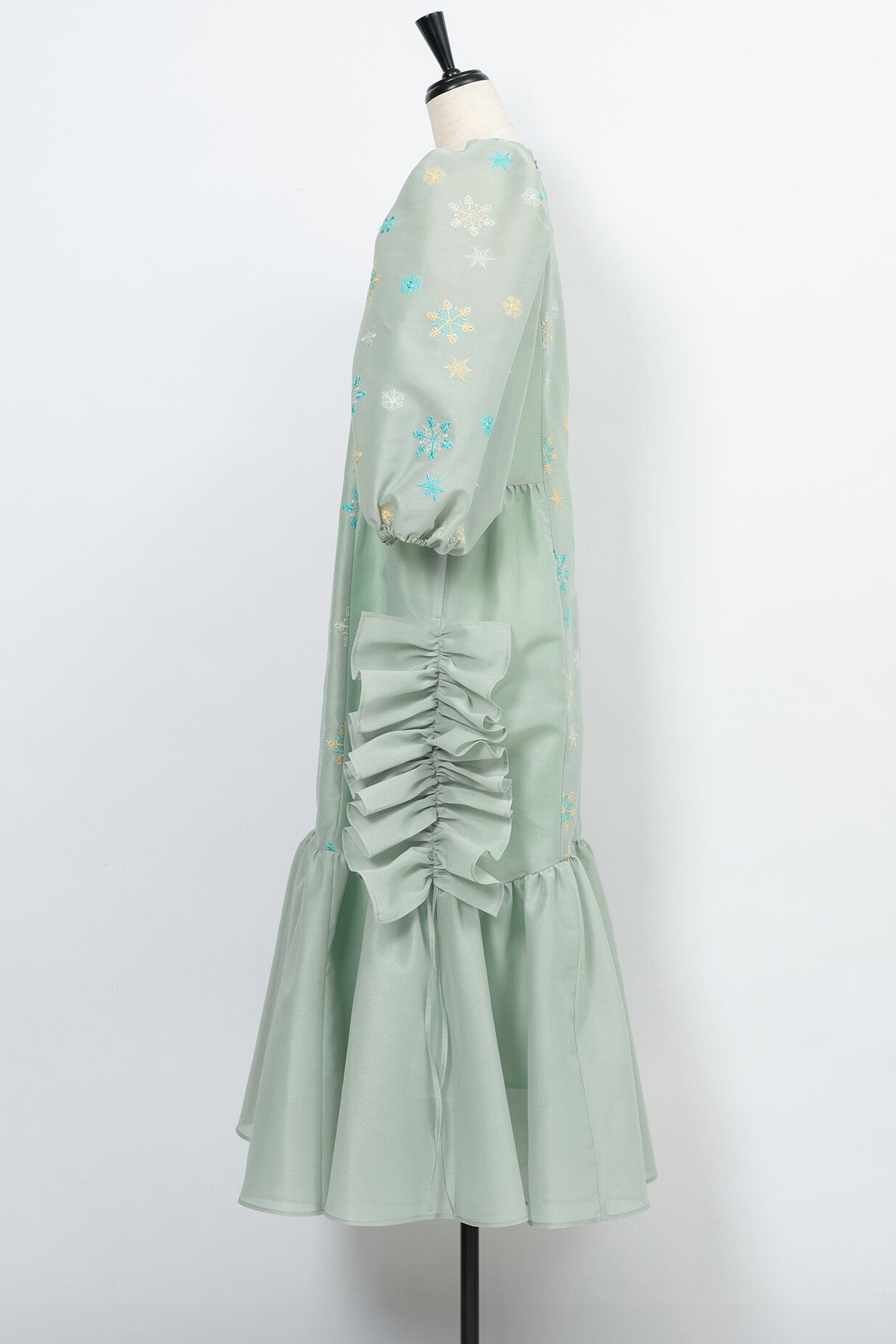 華やかなオリジナル刺繍と、ハリあるスパンオーガンジーを異素材で切り替えた一枚で様になるドレス。