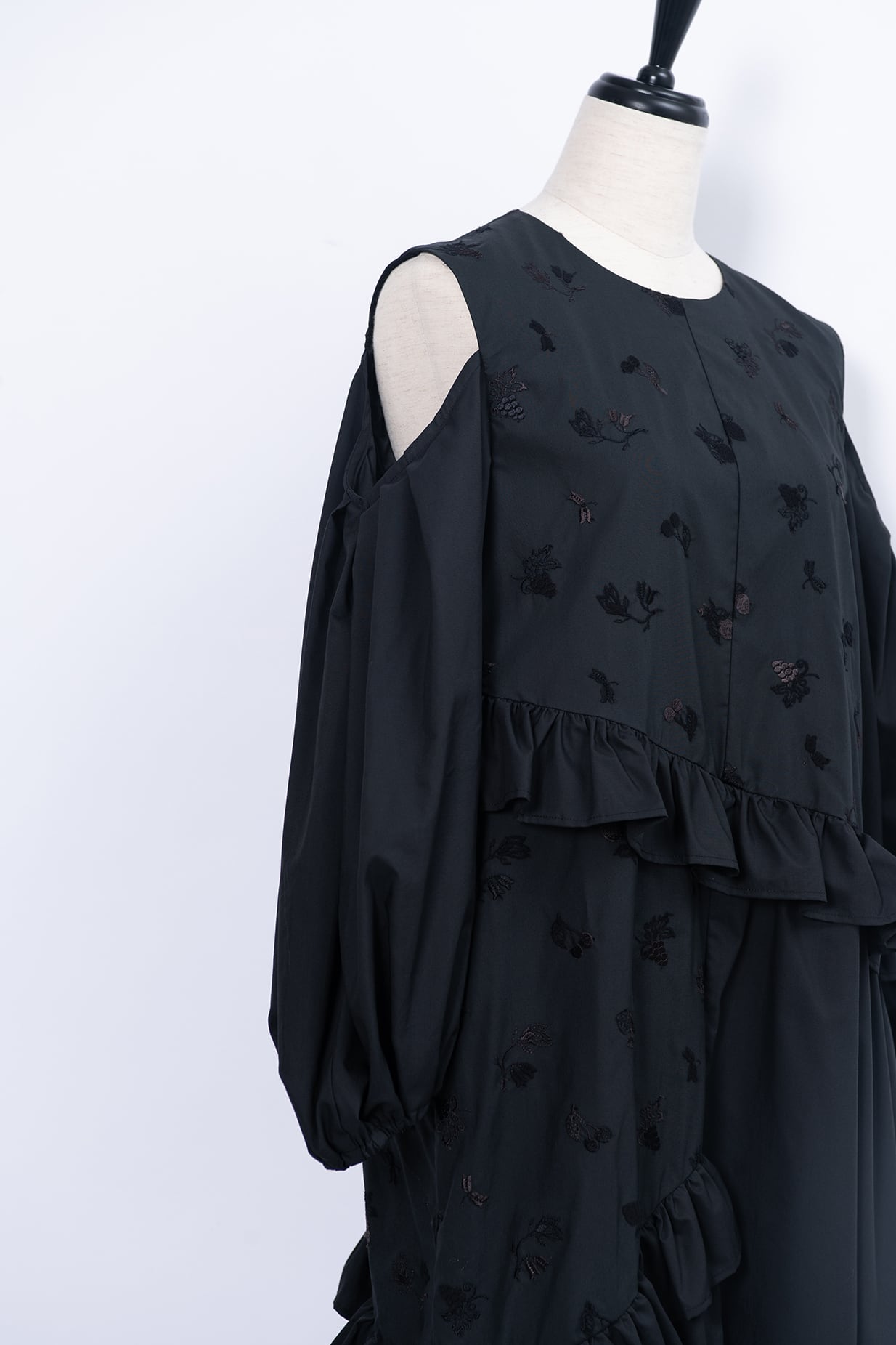 斜めに入ったティアード切り替えには立体モチーフのフリルが施され、動きのあるシルエットを演出。