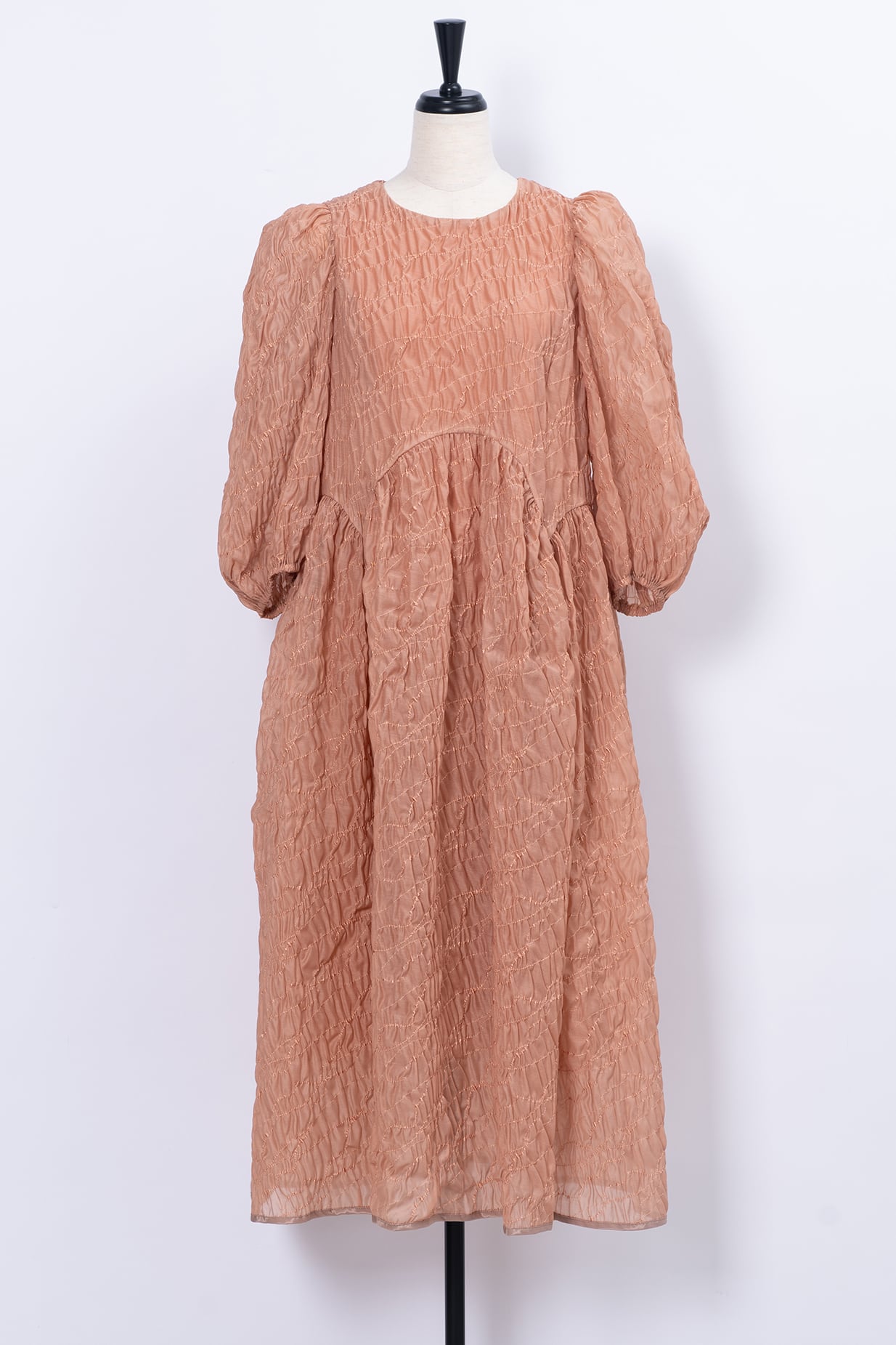 光沢とシアー感のある軽やかなオーガンジーに施されたシャーリング刺繍生地は、まるで装飾的なメロンのメッシュ模様のよう。